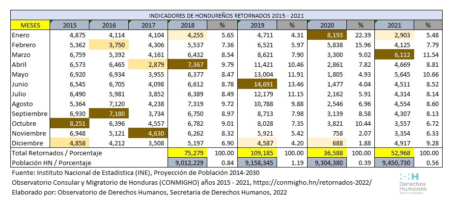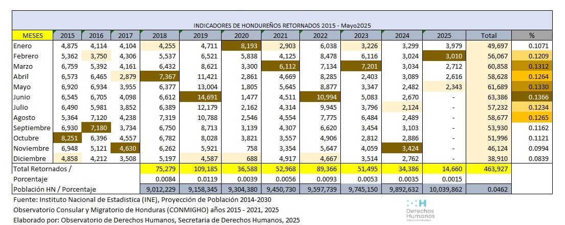 Indicador de Hondureños Retornados Mensual x Año de 2015-2021, 2015-Mayo2025